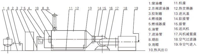 燃料經由過程熄滅器熄滅,發生低溫煙氣。并借助具備強化換熱辦法的熱風爐將低溫煙氣的熱量傳導給被加熱的氛圍,低溫燃氣經熱量披發后溫度下降至250℃以下由引風機排放大氣。需加熱的氛圍經由過程選配的鼓風機強送入熱風爐、吸熱后溫度升至額外值從熱風出口送出,當熱風溫度下降到而定的上限溫度時,熄滅器又會從頭撲滅運轉或轉為大火焰熄滅,升溫的速率可調進風閥來完成。